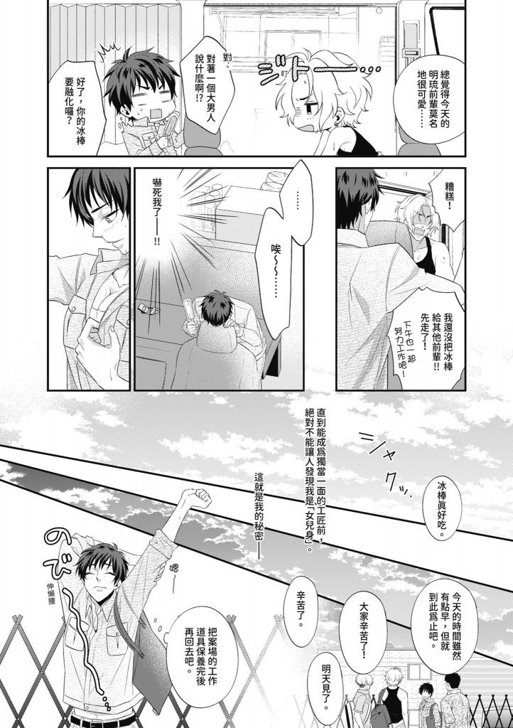 | 「我會好好珍視你的,所以讓我來讓妳舒服吧?」 因挑逗而變硬的乳頭被舔舐與輕咬,從未體驗過的快感與期待讓那裡變濕了⋯⋯ 原以為只是個可愛後輩的阿匠,如今展現出男性的一面對我步步逼近⋯⋯我已經忍不住了——! 明琉有個秘密——那就是穿著男裝做工這件事! 但某天竟被後輩的匠發現了我其實是個女生。 「得知妳是女孩子後,我已經無法忍耐了……」 一直認為是輕挑後輩的阿匠,突然變成了充滿慾望的男性……? 被比自己大的雙手擁抱,炙熱的舌頭纏繞……無意中漏出色情的聲音! 似乎是要讓人著急般地舔舐著陰蒂,裡面也已變得黏黏稠稠。 我以前從未了解的「女孩子」的舒服之處,如今正在被開發——!! |